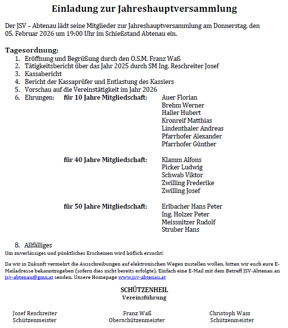 Im Namen des JSV-Abtenau bedanke ich mich und verbleibe mit einem kräftigem Schützenheil